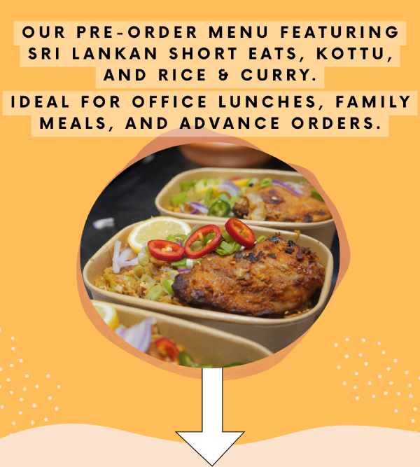 Featuring Short Eats, Kottu, and Rice & Curry — ideal for office lunches and relaxed gatherings.